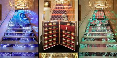 Infatti la scala principale interna è composta da tanti piccoli schermi al plasma orizzontali (che coprono l’alzata), tutti collegati tra loro per creare strabilianti giochi di luce e di colore. Composizioni video che riproducono onde, cascate, spirali e anche i loghi della Luis Vuitton. Forse hanno un effetto psichedelico per traviare le molli menti delle ricche signore che entrano in negozio e che vengono ipnotizzate e condotte in cima alla scala a svuotare il conto in banca! La mente che ha realizzato questa creazione è quella di Peter Marino.