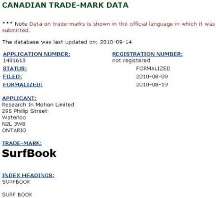 Continua la telenovela con protagonista il tanto atteso tablet di Blackberry che potrebbe chiamarsi a sorpresa Surfbook: l’idea nasce ancora una volta dopo che si è scoperto che RIM – l’azienda canadese proprietaria del marchio – ha registrato tale marchio.