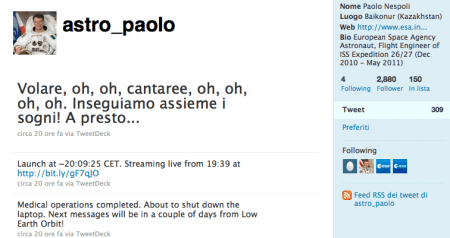 Twitter nello spazio! Paolo Nespoli ha lasciato la Terra a bordo della navetta Soyuz e presto si aggancerà alla Stazione Spaziale Internazionale, la ISS, per una lunga permanenza a bordo di sei mesi con la missione MagISStra. Se siete appassionati di esplorazioni spaziali e amate le foto del nostro pianeta dall’orbita, allora diventate subito follower dell’astronauta italiano su Twitter. All’indirizzo @astro_paolo potete seguire in diretta le attività della missione e presto magari anche qualche immagine. E’ quello il canale ufficiale, aggiornato dallo stesso Paolo che ha scelto una citazione da una canzone conosciuta da tutto il mondo per inaugurare i cinguettii dall’orbita!