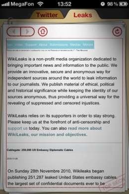 WikiLeaks App è il nuovo software per iPhone, iPod Touch e iPad, reso disponibile da pochissimo per il download su App Store di iTunes che – come da nome – si dedica al sito più discusso di questo 2010. WIkileaks, il portale delle informazioni scomode, fondato e sostenuto anche dal carcere da Julian Assange, accede a iTunes con un’applicazione ufficiale che da un lato consente l’accesso a tutte le informazioni con una pratica interfaccia e dall’altra sostiene le organizzazioni per la democrazia online, donando alla causa una cospicua parte del costo dell’app. In gallery, ecco qualche screenshot.