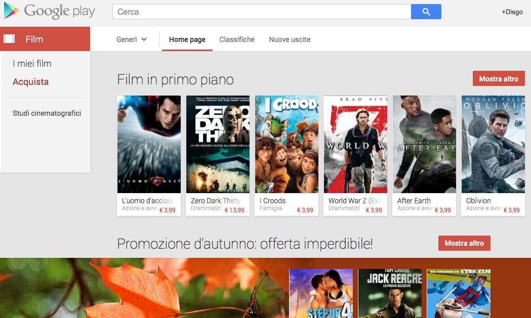 I Film per Android sono arrivati e sbarcano ovviamente sul Google Play ossia sullo store di casa che già offriva ebook, applicazioni e giochi oltre che musica. Sarà possibile noleggiare oppure acquistare video a un prezzo rispettivamente da 2.99 euro e 7.99 euro a definizione standard e si potrà godere delle pellicole su qualsiasi dispositivo sincronizzato con la propria utenza dunque si potrà ad esempio iniziare a guardare il film sul tablet o smartphone e proseguire sul computer di casa. Sono già tanti i video disponibili dai classici come Cantando sotto la pioggia alle ultime uscite come Oblivion, World War Z, After Earth senza dimenticare gli amatissimi film come Ghost, Notting Hill e Beethoven e così via.